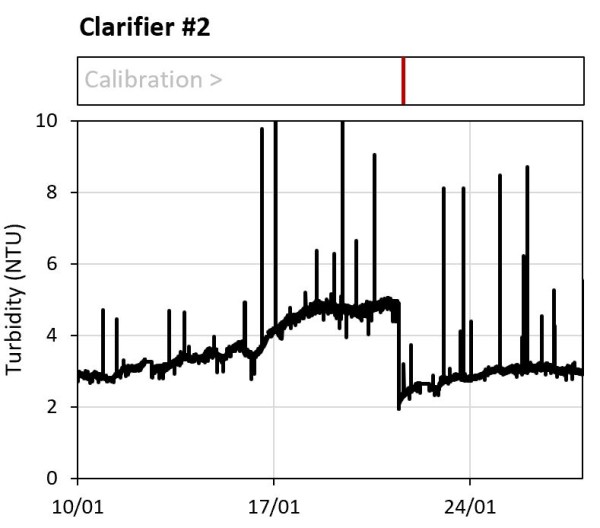 Take a look at this next example of an XY graph showing a raw water turbidity event. The left-hand version is presented as if there was a steady increase in turbidity to a peak at around 95 NTU. In reality the data does not support this conclusion. The data points are shown in the right-hand graph. This shows the event peak may have been 95 NTU or it may have been much higher. There may have been a steady increase in turbidity, or it may have suddenly spiked.