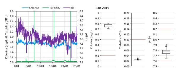 This next example is an XY graph of treatment plant performance. It shows treated water turbidity, chlorine residual and pH for the month of January. The readers eyes and brain have to do a lot of work to evaluate performance for each variable with this graph type.