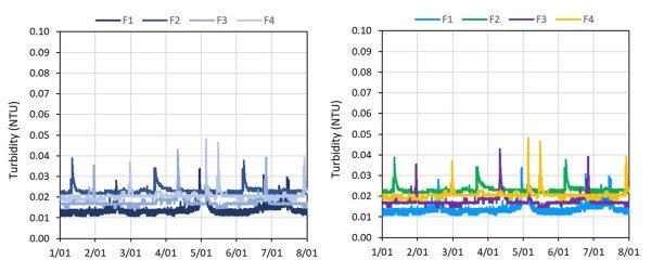 How many times have you seen poorly scaled graphs that obfuscate the data? Here are a few examples of poorly scaled graphs with potential alternatives. In this first example the graph has been set to the instrument scale. The spikes up to 1,000 NTU aren’t adding any value. A simple re-scale shows the data, without losing any important detail.