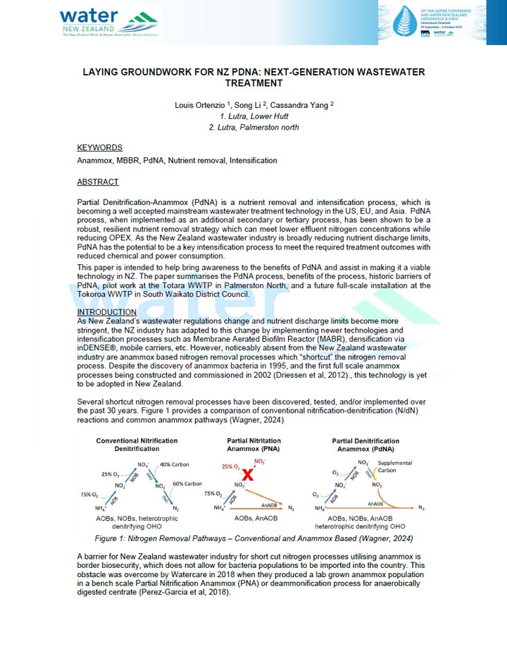 As New Zealand’s wastewater regulations change and nutrient discharge limits become more stringent, the NZ industry has adapted to this change by implementing newer technologies and intensification processes such as Membrane Aerated Biofilm Reactor (MABR), densification via inDENSE®, mobile carriers, etc. However, noticeably absent from the New Zealand wastewater industry are anammox based nitrogen removal processes which “shortcut” the nitrogen removal process. Despite the discovery of anammox bacteria in 1995, and the first full scale anammox processes being constructed and commissioned in 2002 (Driessen et al, 2012)., this technology is yet to be adopted in New Zealand.